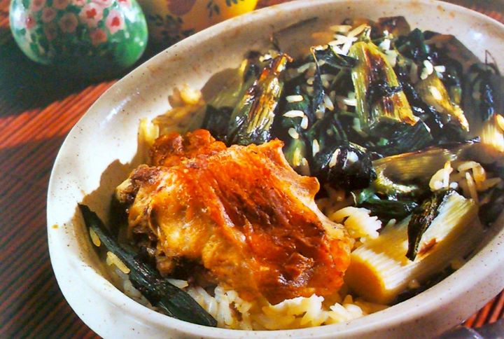 - Συνεχίστε το ψήσιμο, ώσπου να μαλακώσει το ρύζι και να ροδίσει το κρέας και από αυτήν την πλευρά. Αν δείτε ότι το ρύζι και τα κρεμμύδια στεγνώνουν και το κρέας θέλει κι άλλο ψήσιμο, καλύψτε την επιφάνεια με αλουμινόχαρτο και συνεχίστε το ψήσιμο. Ίσως χρειαστεί να προσθέσετε κι άλλο νερό. Προσέξτε όμως να μη λιώσουν τα κρεμμύδια και λαπαδιάσει το ρύζι.