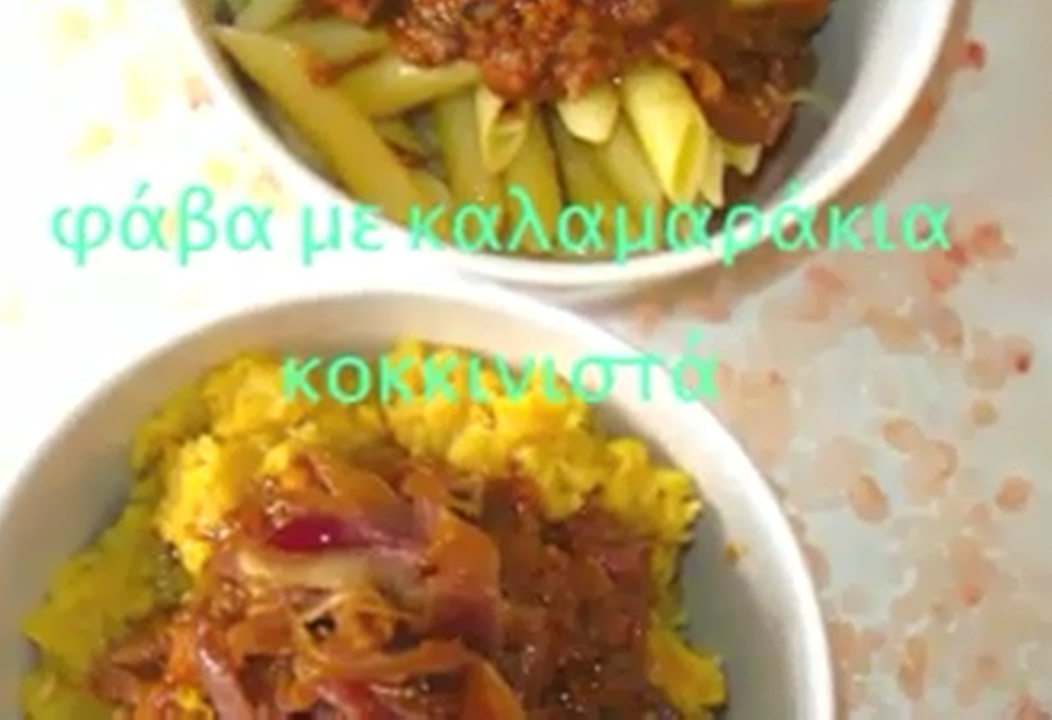 Καλαμαράκια Κοκκινιστά με Ζυμαρικά ή με Φάβα και Καραμελωμένα Κρεμμύδια